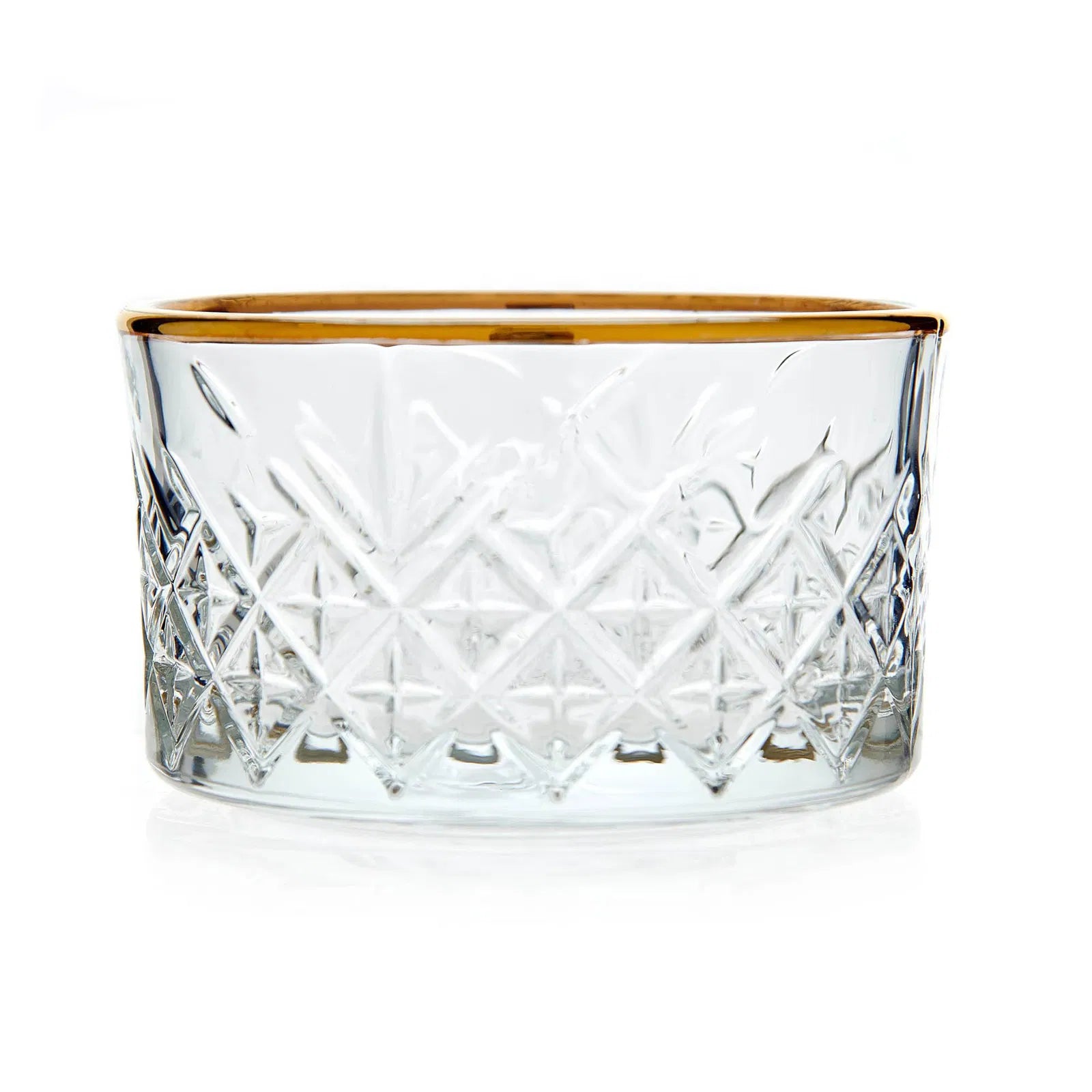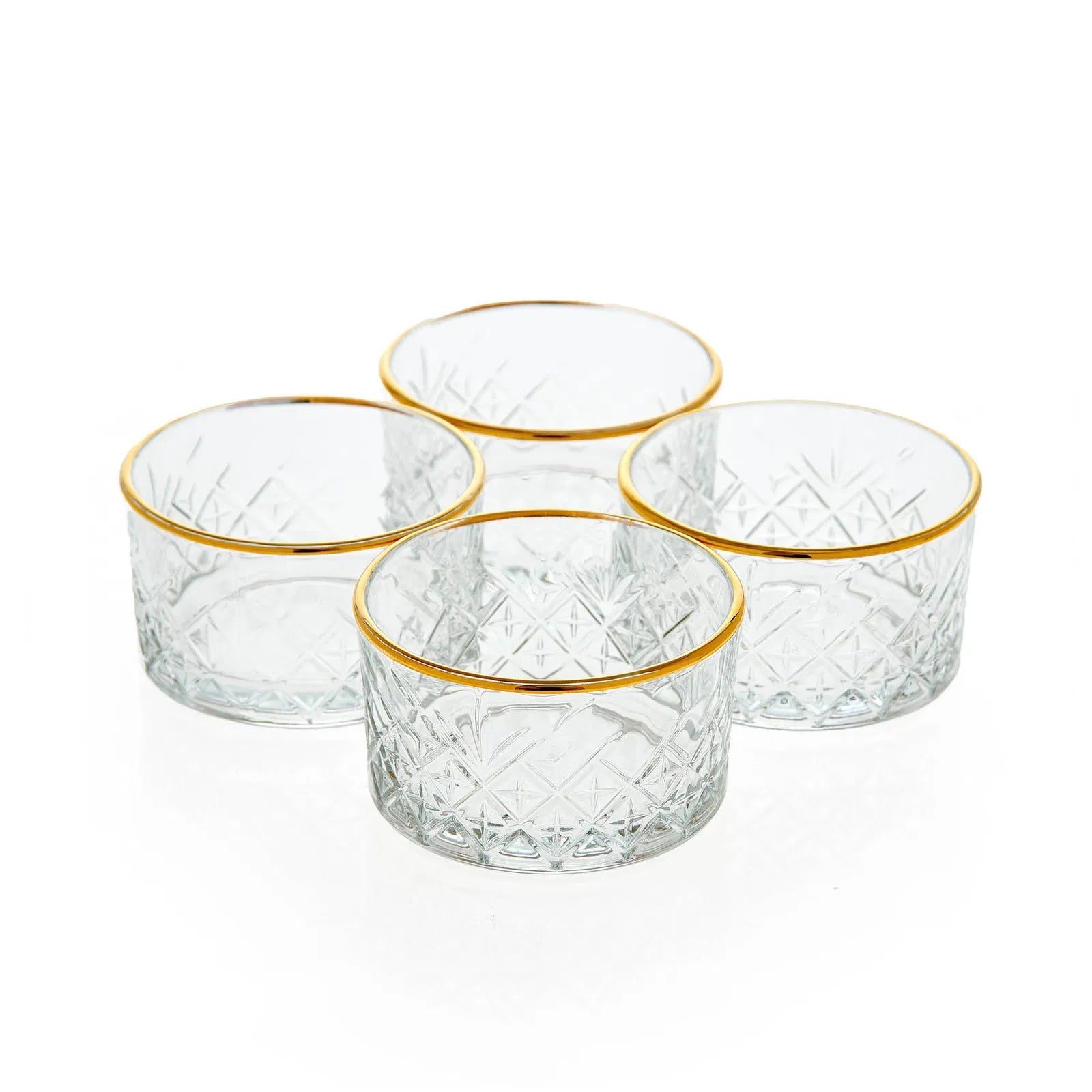 The Pasabahce Timeless Golden Bowl 225 cc set of 4 combines elegance and functionality. Featuring delicate crystal patterns and refined golden ring accents, these bowls elevate any table setting. Ideal for serving fruits, nuts, or small delicacies, they add a sophisticated charm that enhances the presentation and aesthetic of your gatherings.